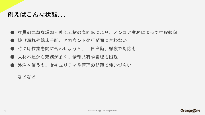 ・新入社員や外注先の入れ替わりが多く、PC/アカウントの払い出し業務、問い合わせ対応などノンコア業務に忙殺され疲弊している。