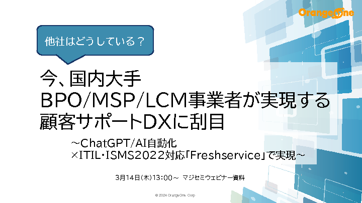本ウェビナーでは、こうしたBPO/LCM/MSP市場のトレンド変化となぜ今、業界でChatGPT・AI自動化対応のFreshserviceが求められているのかについて話していきます。