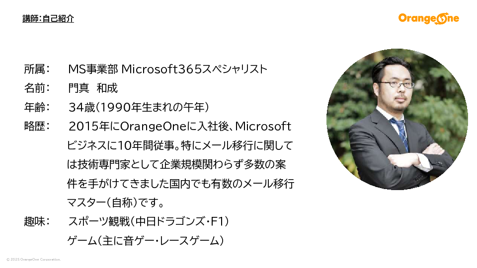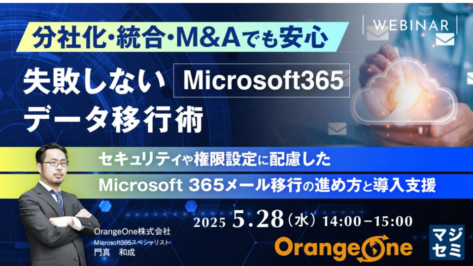 本セミナーでは、Microsoft 365およびExchange Onlineのメール・データ移行に強みを持つOrangeOneが、移行プロジェクトを安全かつ確実に進めるための設計・準備・実行フェーズのポイントをわかりやすく解説します。