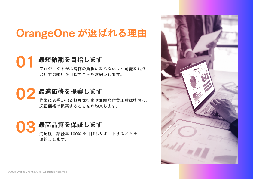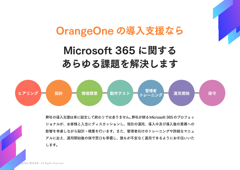 本セミナーでは、 600社以上の導入サポート実績15年以上のMicrosoft 365導入経験 をもつ OrangeOne が、失敗しない移行の具体策を解説します。数ある移行ツールの中からお客様の環境に合った移行ツールを選定し、段階的な計画立案、管理者向けトレーニングを組み合わせ、技術的な課題や業務影響を最小化するアプローチを紹介。さらに、最適なテンプレートや詳細マニュアル、構成・運用・移行の複雑性や個別要望に応じた柔軟な対応、豊富なナレッジに基づく導入後サポートプランを提供し、安心して任せられる体制を整えています。加えて、Office製品とライセンス統合によるコスト削減や、Microsoft 365上位ライセンスでの包括的なセキュリティ実装事例も取り上げ、移行を検討する企業に「確実な道筋」を示します。