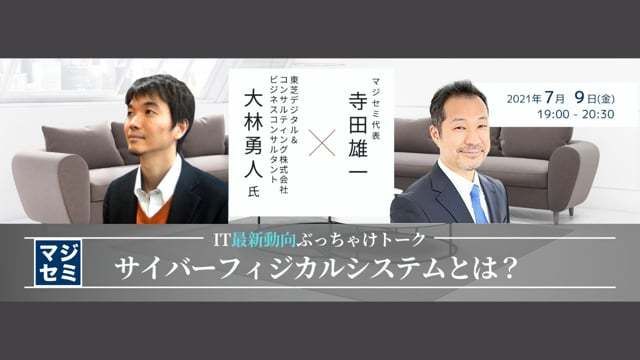 今回は、ちょっと難しい「サイバーフィジカルシステム」について、東芝デジタル&コンサルティング株式会社 ビジネスコンサルタント 大林勇人氏とマジセミ代表寺田雄一が対談しながら、わかりやすく解説します!