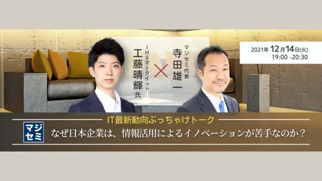 今回は、IHS マークイット 工藤晴輝氏をゲストとしてお招きし、なぜ日本企業は、情報活用によるイノベーションが苦手なのか、それをどう克服すればよいのか、をテーマにぶっちゃけトークを展開します。