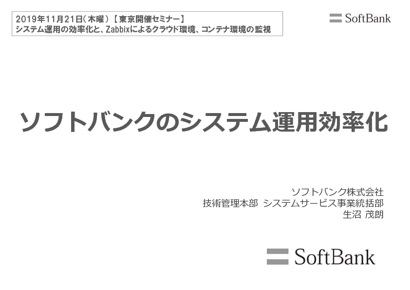 本セミナーでは、運用監視ツールとしてZabbixを全面的に使っているソフトバンクが、システム運用の自動化・効率化をどのように行ったのか、その事例をソフトバンクの方、自ら語って頂きます。