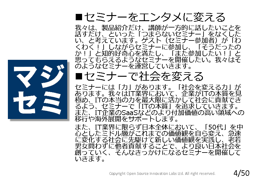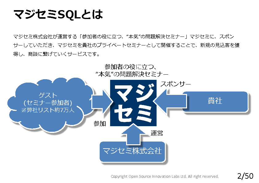 ※本コミュニティにご提示いただいた情報、及び、申込時にご記載頂いた内容、当日受付でご提示頂いた名刺情報は、マジセミ株式会社にて収集し、マジセミ株式会社/オープンソース活用研究所、及び、主催・共催・協賛・協力・講演の各企業へ提供します。ご記入頂いた個人情報は、マジセミ株式会社/株式会社オープンソース活用研究所及び主催・共催・協賛・協力・講演企業にて厳重に管理し、各社のサービス、製品、セミナー、イベントなどのご案内に使用させて頂き、また各社のメルマガに登録させていただきます。ご記入頂いた個人情報は、法で定める場合を除きご本人の同意を得ることなく第三者へ提供いたしません。利用目的遂行のため個人情報の取扱いを外部に委託する場合は、委託した個人情報の安全管理が図られるように、委託をする各社が定めた基準を満たす委託先を選定し、委託先に対して必要かつ適切な監督を行います。 お客様の個人情報に関する開示等は、お申し出頂いた方がご本人(代理人)であることを確認した上で、各社において合理的な期間および範囲で対応いたします。開示等の手続き、個人情報の取扱いに関するお問い合わせは下記のお問い合わせ窓口へご連絡下さい。