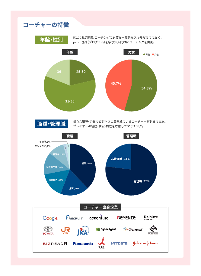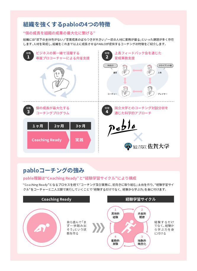 大きな特長として、育成対象となるメンバーへのアプローチが「内省支援」であること、適切なコーチャーをアサインできる点、