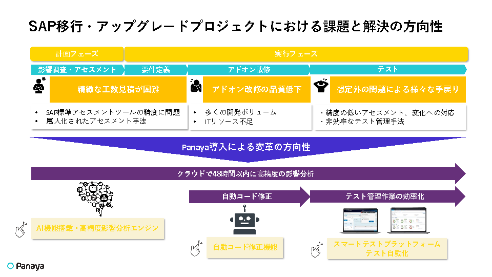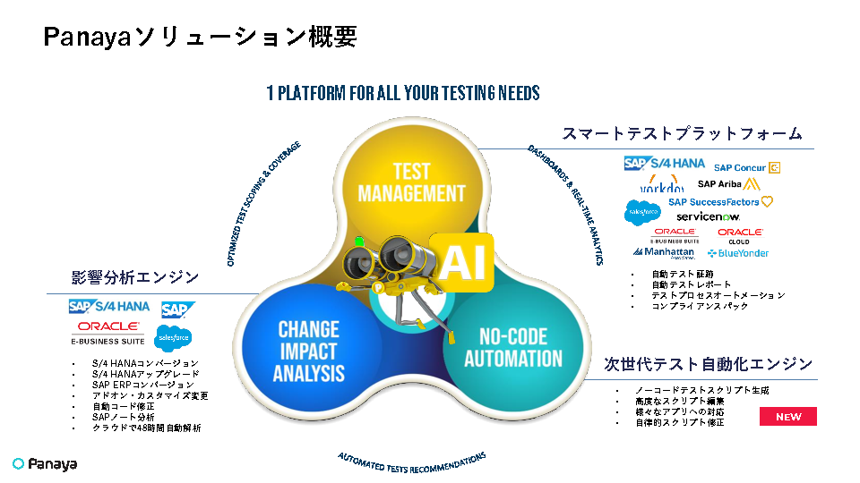本セミナーでは、Panaya社の総合的なテストソリューションのご紹介に加え、ERPやWebシステムのテスト業務のExcel依存から脱却し効率化を図る具体的な自動化アプローチをご説明します。また、40年以上にわたり、1,100社以上のサービス・製品の品質向上に貢献してきたベリサーブから、テスト効率化の効果を最大化するために、テストプロセス・テスト自動化・手動テストの3つの側面から、効率化のポイントや、その具体的な手法を解説します。さらに、現場で定着・活用されるための運用設計や伴走支援のポイントを事例とともに、属人化の解消と持続可能な改善を実現するためのヒントをお伝えします。これらのアプローチは、テスト負荷を大幅に削減できるとともに、金融システムのように監査や規制対応が求められる領域でも適用可能なアプローチとして活用いただけます。