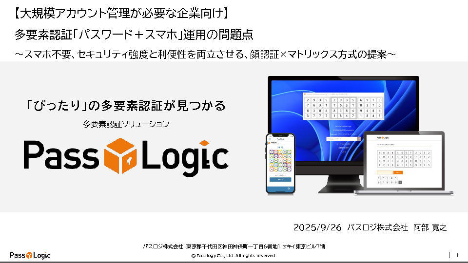 14:05~14:20 「パスワード+スマホ」の多要素認証、運用面の問題点と、PassLogicの紹介(パスロジ株式会社)