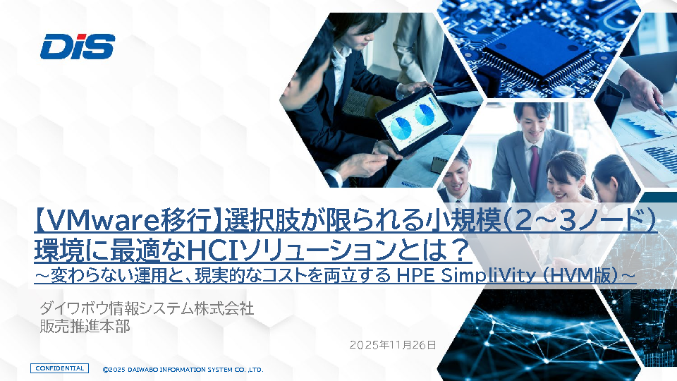 本セミナーでは、VMware依存からの脱却を図る2~3ノード構成の小規模環境を対象に、HPE SimpliVity(HVM版)を活用した現実的で効果的な移行手法をご紹介します。