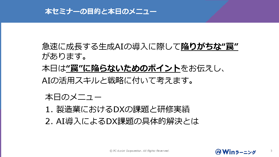 本セミナーでは、このような生成AI活用によるDX推進の方策の一つとして、「使う人」に焦点を当てた人材育成の手法をお伝えいたします。