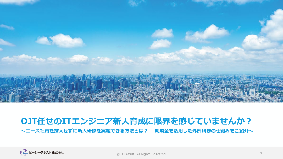 13:05~13:45 OJT任せのITエンジニア新人育成に限界を感じていませんか? ~エース社員を投入せずに新人研修を実施できる方法とは? 助成金を活用した外部研修の仕組みをご紹介~