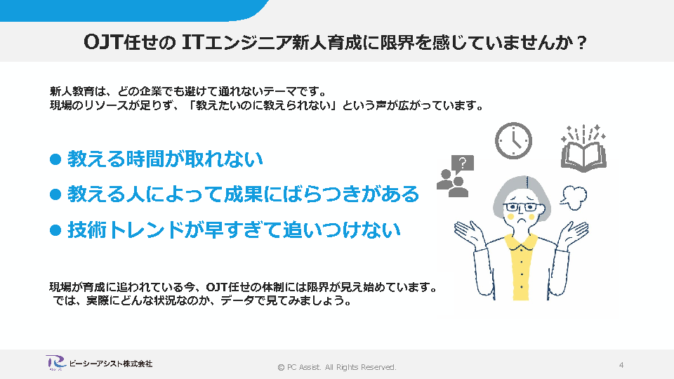 新人技術者の早期育成は、企業の競争力を左右する重要課題です。しかし、教育の仕組みを社内で整備するには、人材・時間・ノウハウといったリソースが必要で、多くの現場ではOJTに頼らざるを得ない状況です。その結果、「教える人がいない」「教える余裕がない」「教育が属人化して品質が安定しない」といった課題が顕在化しています。