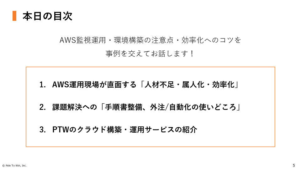 本セミナーでは、属人化したAWSの環境構築や監視運用を効率化するサービスをご紹介します。