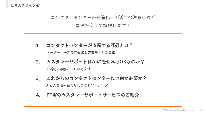 本セミナーでは、AIを含めた自動応答の課題について解説するとともに、それらを解決する効果的なアウトソーシングサービスについて紹介します。