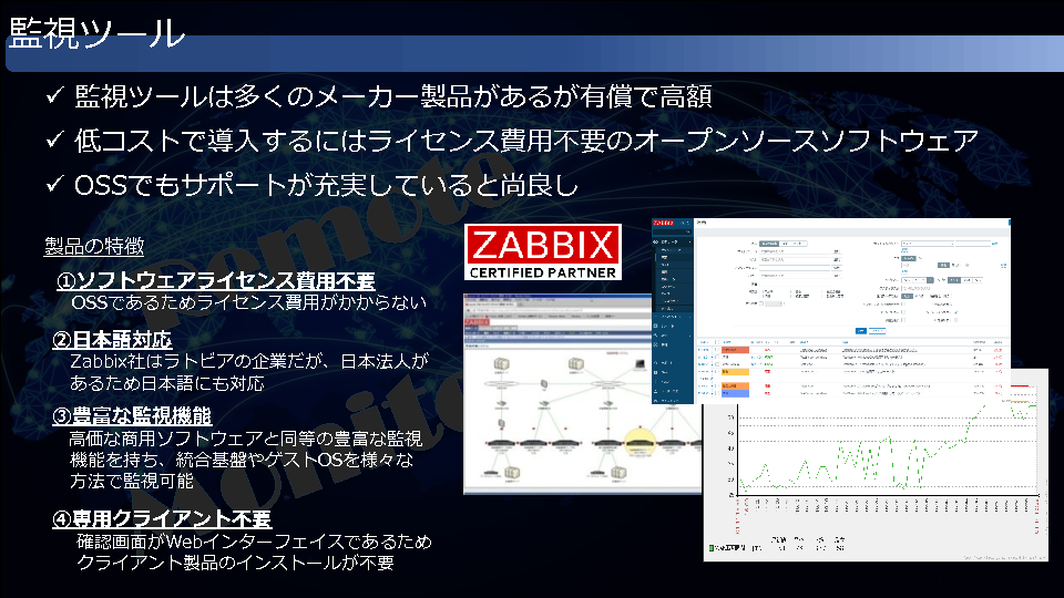 有償製品からOSSまで監視ソフトウェアは多々ありますが、自社で構築・運用する場合、構築、運用、体制維持と多くのコストが掛かってしまいます。監視規模が大きければ費用対効果を高めることができますが、中規模・小規模システムの場合はメリットが少ないのが現状です。