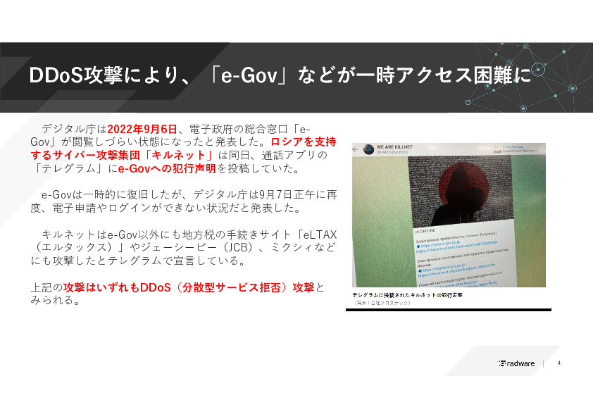 Webサーバー等に対し、複数のコンピューターから大量のパケットを送りつけることでサービス提供を妨害するDDoS(Distributed Denial of Service)攻撃。日本は2020年よりこのDDoS攻撃の標的国Top5に入っており、その脅威がより身近なものとなってきています。昨今のグローバルの政治不安定の背景からも攻撃は増加傾向にあり、電子政府の総合窓口「e-Gov」でも被害を受ける等、国内でも具体的な被害が出ています。特にインフラ系、金融機関、サービスプロバイダー等の業界は狙われやすく、対策が必要です。