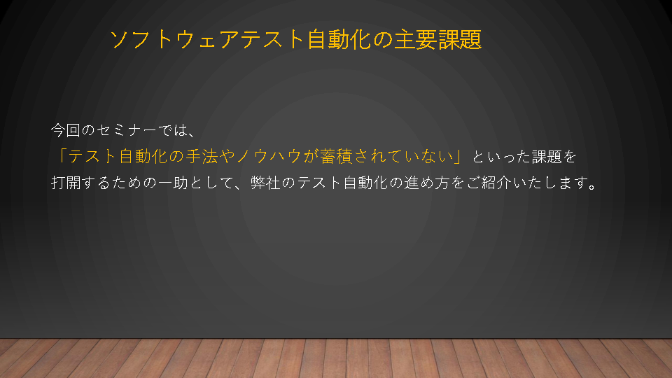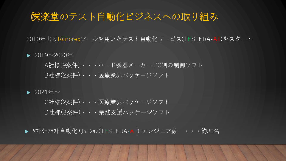 本セミナーでは、「UIテスト・回帰テストの工数、労力が膨大。テストノウハウが属人化」をテーマに、楽堂が提供するUIテスト自動化ソリューションおよびUIテスト自動化ツール Ranorexについて紹介します。