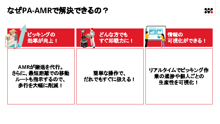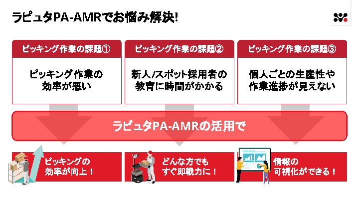 12:05~12:45 物流・製造業向け ムラ・ムダの多いピッキング作業 スタッフの歩く距離と生産性の関係とは~フルロボティクスは敷居が高い 作業スタッフとピッキングアシストロボットで実現するピッキングとは~