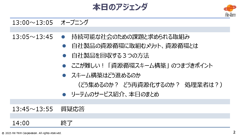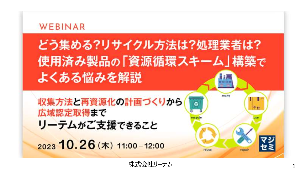 11:05~11:45 どう集める?リサイクル方法は?処理業者は?使用済み製品の「資源循環スキーム」構築でよくある悩みを解説 ~収集方法と再資源化の計画づくりから広域認定取得まで、リーテムがご支援できること~