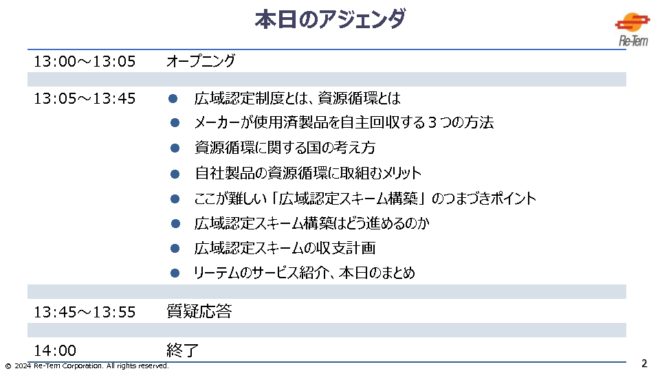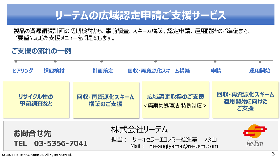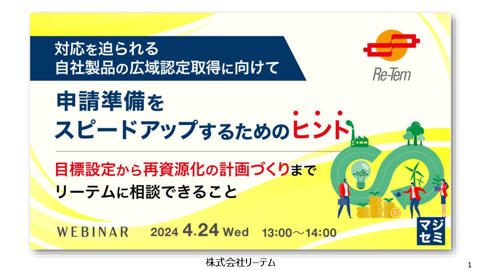 13:05~13:45 対応を迫られる自社製品の広域認定取得に向けて、申請準備をスピードアップするためのヒント ~目標設定から再資源化の計画づくりまでリーテムに相談できること~