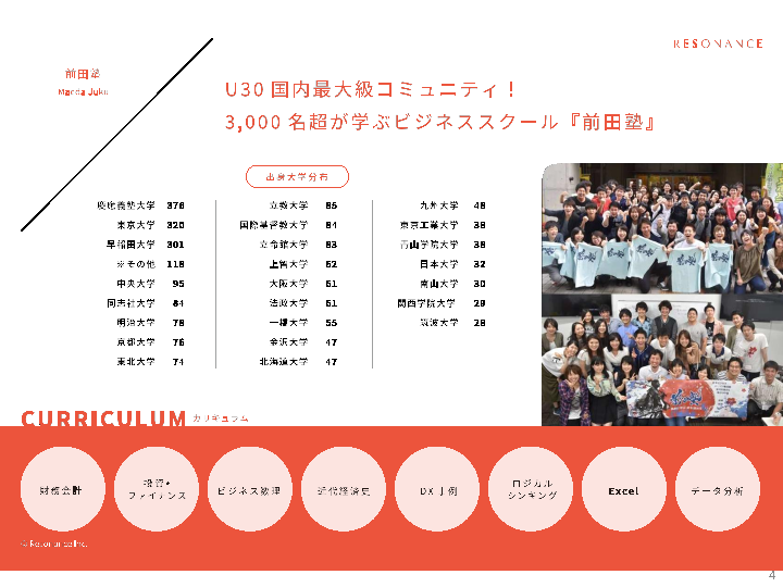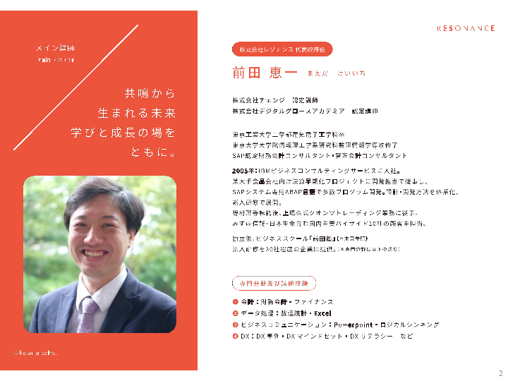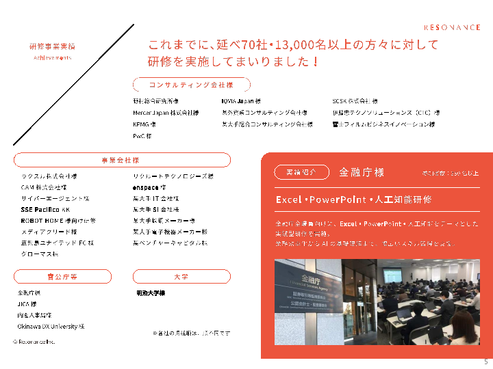 レゾナンスは、長年、「講師との距離が近く、フランクに学び合える学習環境」をコンセプトに、企業向けの財務会計・ファイナンス研修を提供してまいりました。各企業の課題に応じて研修テーマを柔軟にカスタマイズして実施しています。