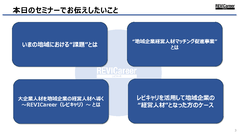 このセミナーでは、実際にレビキャリ転職を体験され、大企業から地域企業の経営人材に転職された方々の実像や具体的事例を紹介しながら、レビキャリ転職のメリットや魅力について、詳しく解説します。