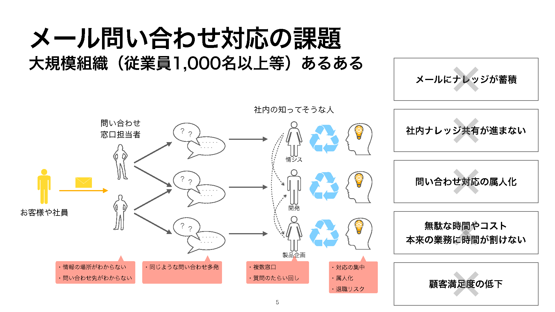 しかし、メールの内容はCCでメンバーに共有されているとはいえ、そこに蓄積されているナレッジを的確に検索することは難しく、全く活用できていないのが現状です。