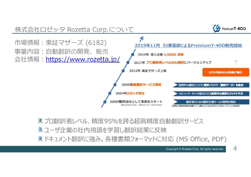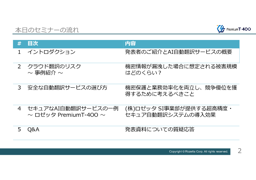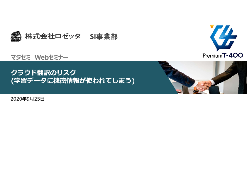 本セミナーでは、上記のようなクラウド翻訳のリスクについて解説するとともに、医薬・化学・機械・IT・法務・金融など2,000分野の専門分野データベースを蓄積し、4,500以上の導入実績を持つAI自動翻訳 T-4OO を、認証連携やプライベート接続などと合わせてよりセキュアにご利用頂ける「Premium T4OO」についてご紹介させて頂きます。
