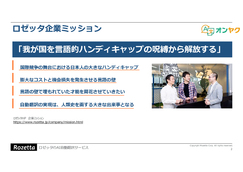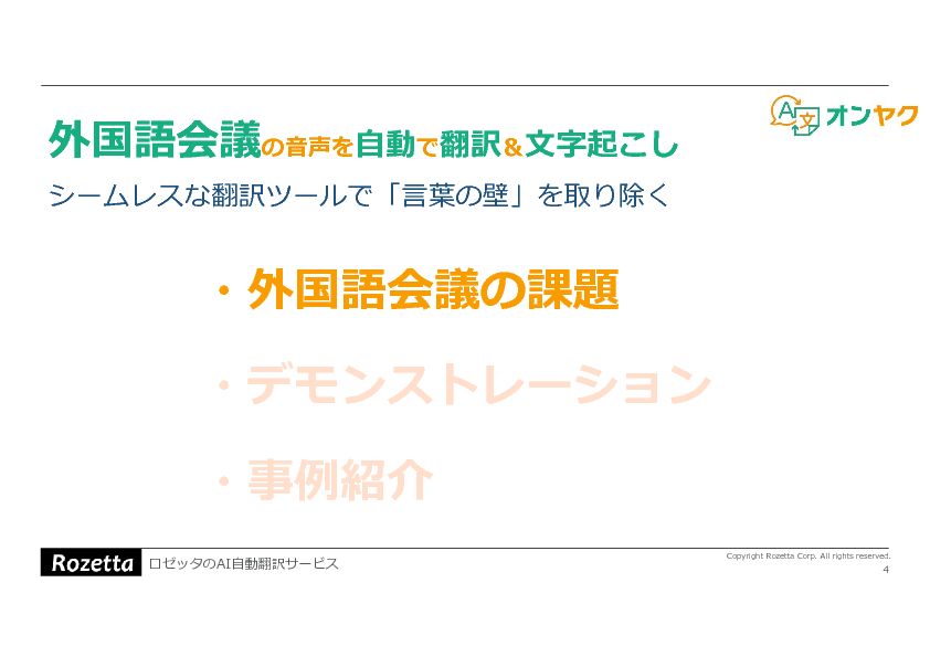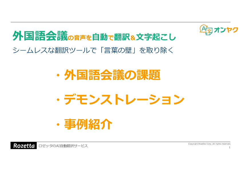 そこで本セミナーでは、デバイスを問わず使うことができるロゼッタ社の会議音声翻訳ツール「オンヤク」を紹介します。