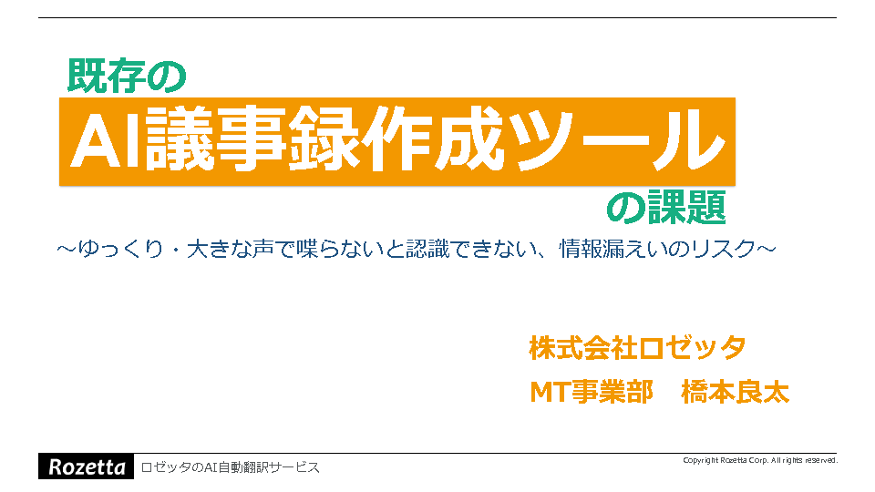 11:05~11:45 既存のAI議事録作成ツールの課題~ゆっくり・大きな声で喋らないと認識できない、情報漏えいのリスク~