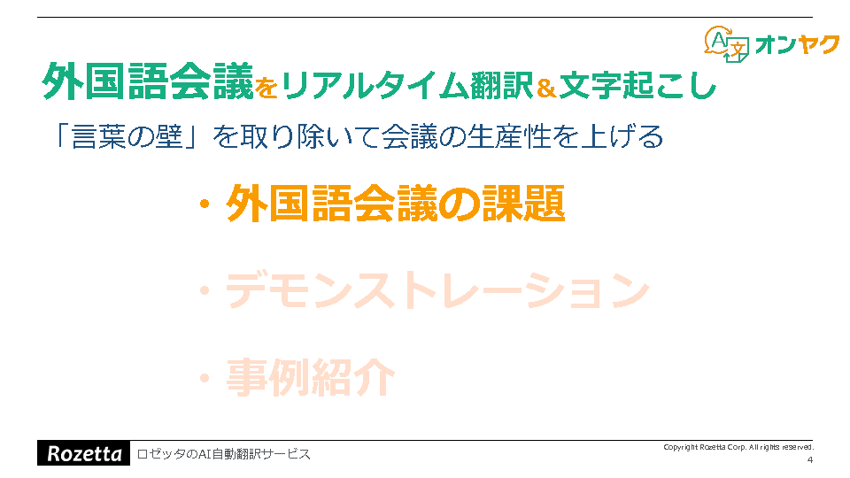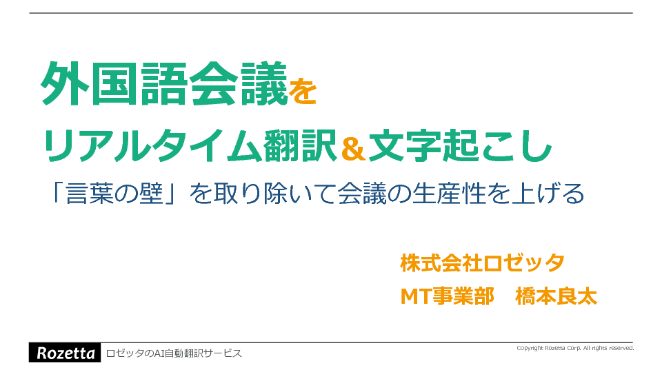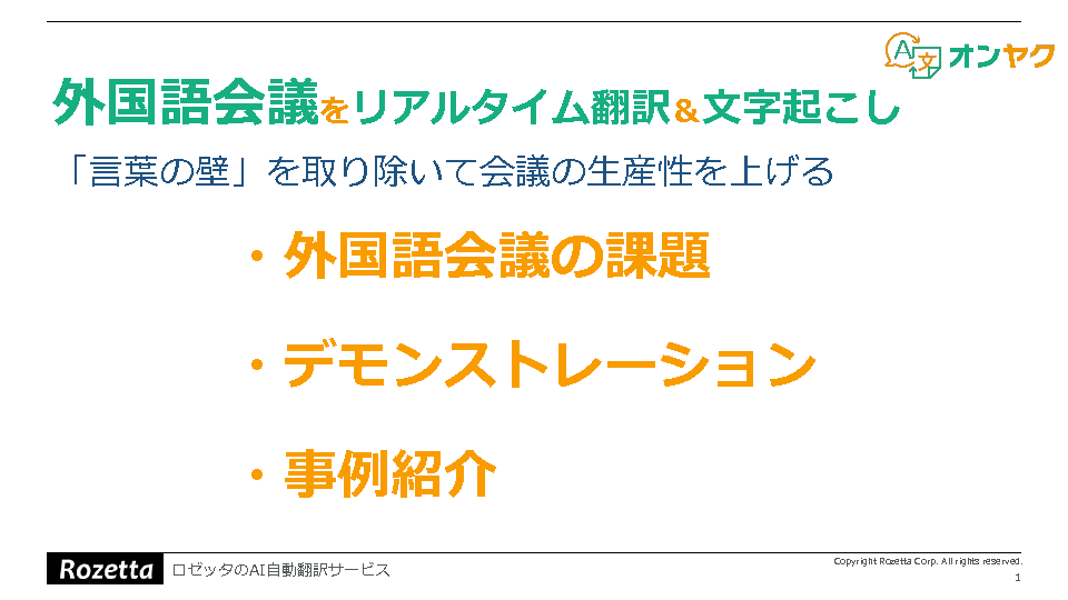 そこで本セミナーでは、会話内容を高精度で認識して自動文字起こしを行い、さらに議事録の作成も可能なロゼッタ社の会議音声翻訳ツール「オンヤク」について、デモを交えながら紹介します。