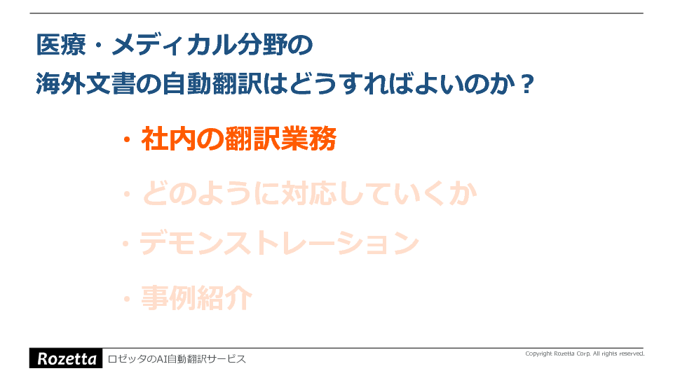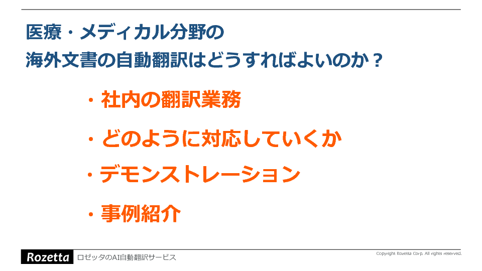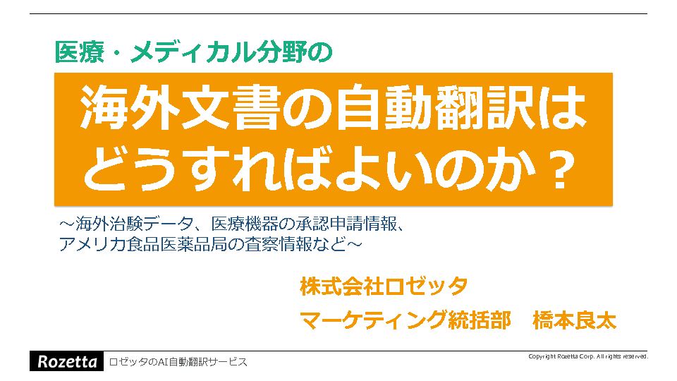 そこで本セミナーでは、医療・メディカル分野の海外文書を自動翻訳することで、大量の翻訳をスピーディに行う方法を解説します。