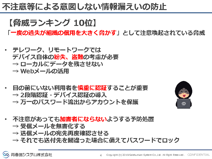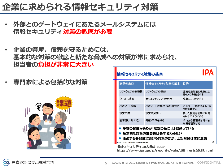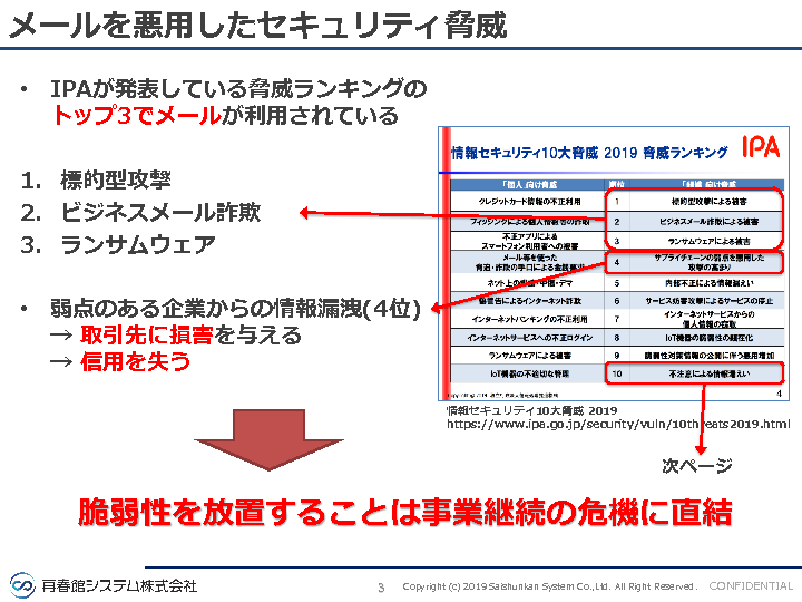 IPAにおいても「情報セキュリティ10大脅威(2020年)」の1位~5位のうち3つがメールに関する脅威という発表を行っています。