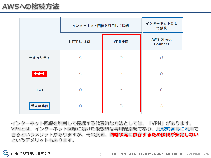 自社拠点からAWSに接続する際は、VPNかAWSダイレクトコネクトのいずれかを選ぶことが多いですが、VPNはセキュリティに不安があり、AWSダイレクトコネクトは従量課金のため利用者が増えると費用が上がるというデメリットがあります。またダイレクトコネクトを利用する場合、ロケーションまでのセキュリティに関しては自社で用意する必要があります。