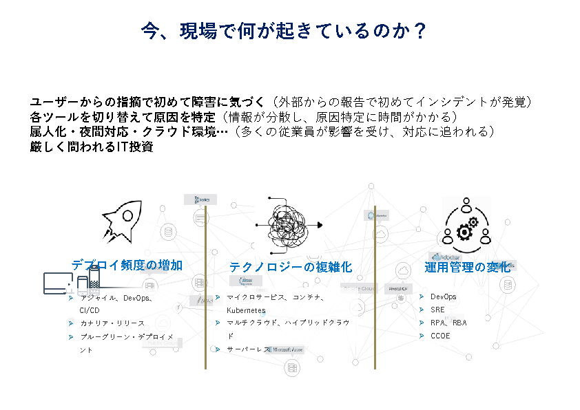 複雑化したITシステムを支える運用業務では、担当者の経験や勘に依存した属人的な管理体制が今も根強く残っています。しかし、その体制では障害の早期発見や迅速な対応が難しく、MTTR(平均復旧時間)の長期化やビジネスへの影響が深刻化しています。さらに、運用ノウハウの継承も困難で、人材の入れ替わりによる品質低下や対応漏れのリスクも顕在化しています。こうした背景から、リアルタイムで情報を可視化し、AIが自動で問題の兆候や根本原因を特定できる、次世代の運用体制への移行が求められています。