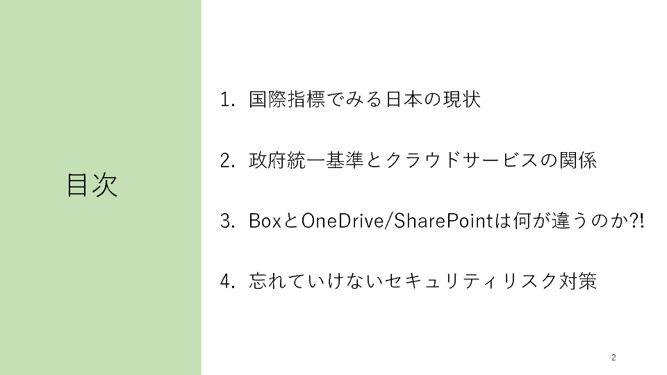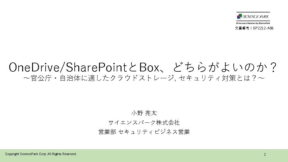 本セミナーでは、OneDriveとBoxの比較を行いつつ、クラウドストレージのセキュリティ確保に最適な方法についてお話します。