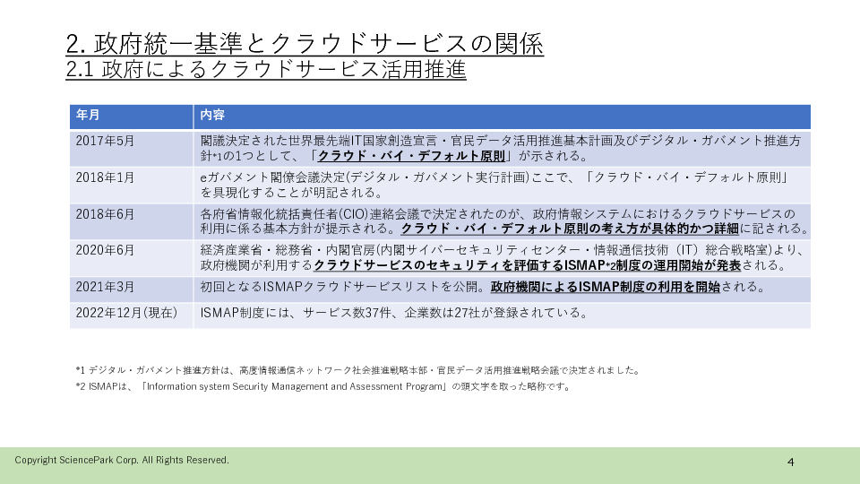 今やデジタル化の推進に欠かせなくなったクラウドサービスにおいてもセキュリティを遵守した運用が求められており、ISMAP(Information system Security Management and Assessment Program)と呼ばれる制度に基づいたクラウドサービスリストの中から調達を行うことが原則となっています。