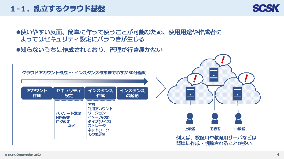 また、「AWS(Amazon Web Services)」「Microsoft Azure」「Google Cloud」などマルチクラウド環境を活用したり、複数の部門やグループ企業などがアカウント権限を持って利用する場合、組織全体のセキュリティポリシー、レベルの統一、一貫したガバナンスの確保が難しくなっています。