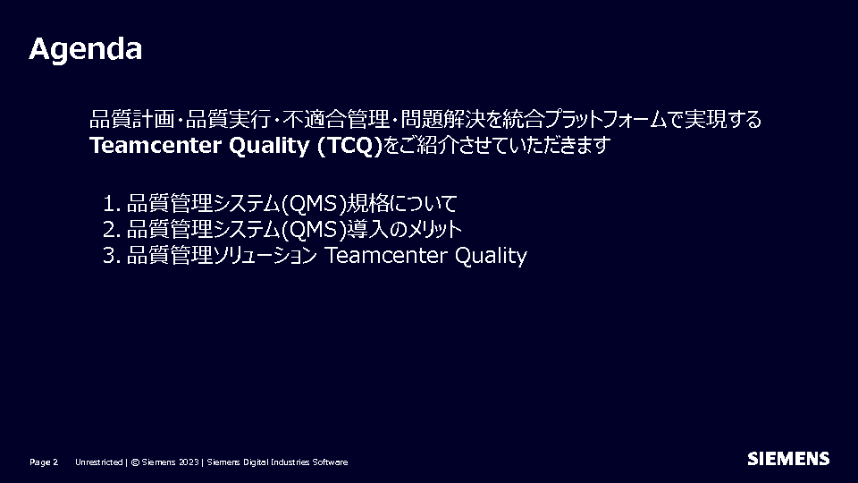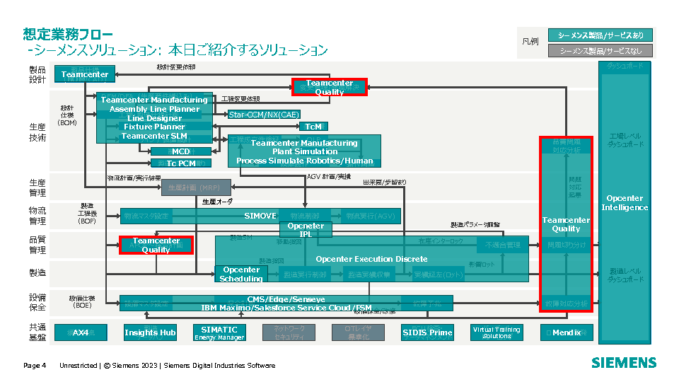 シーメンスのソリューションは、統合管理プラットフォームのTeamcenter、品質管理を支援するTeamcenter Quality、工場の最適化を行うPlant Simulation、生産プロセスを効率化するProcess Simulation、製造実行システムを強化するOpcenter Executionなどで構成されています。これにより、設計データと品質情報の統合管理から、生産工程のBOP/BOEによる最適化、デジタルツイン・デジタルスレッド技術を活用したリアルタイムの生産ライン検証まで、包括的なデジタル環境を実現します。