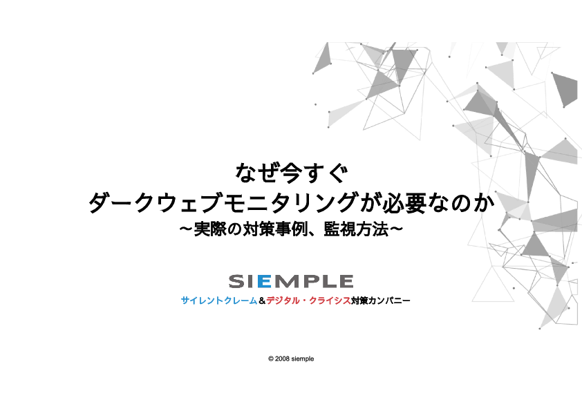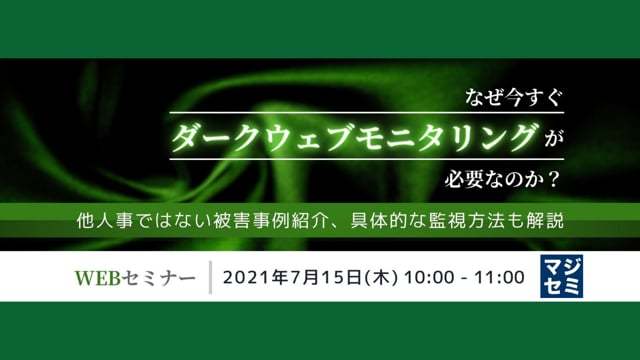 本セミナーでは、近年起きた実際の情報漏えい事案や炎上事例をご紹介しながら、ダークウェブモニタリングの緊急性と重要性について解説いたします。「自社の顧客情報や企業秘密がダークウェブ上に流出していないか調査したい」「自社に対するサイバー攻撃の予告などが出ていないか調査したい」とお考えのある企業様のご参加をお待ちしております。