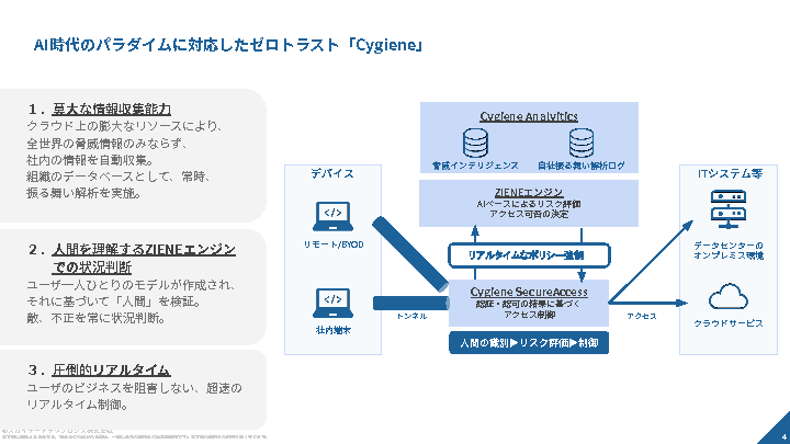 また、ゼロトラストを実装できない現状を打破する具体的な解決方法として、国産のゼロトラストフレームワーク「Cygiene」をご提案。SIEM/UEBAとSASEがシームレスに連携し、強固なセキュリティを実現できる点などを分かりやすく紹介します。
