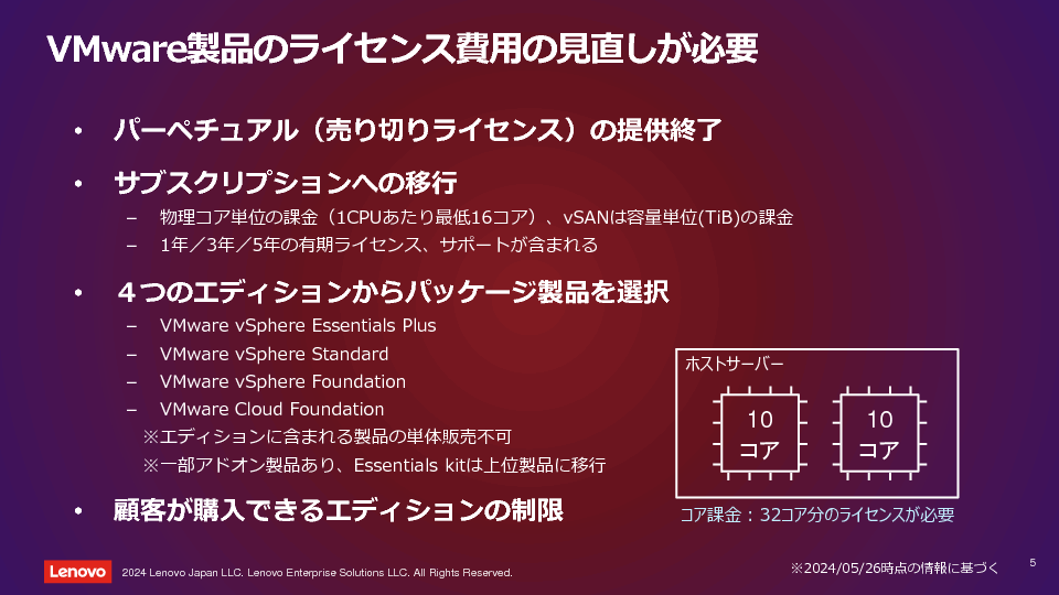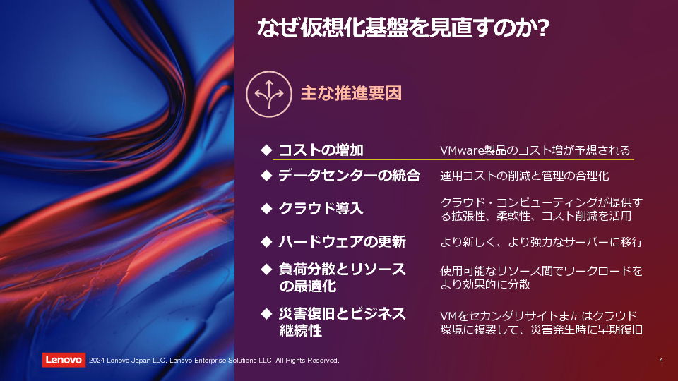 Broadcom による VMware 買収が完了し、VMware ユーザーが懸念していた価格設定、製品体系、サポートへの影響が明らかになってきました。大きな変化として、「ライセンス体系の変更」と「製品ポートフォリオの削減」が挙げられます。これに伴い、VMware ユーザーである各企業はサービス調達やコスト面での影響を考慮し、VMware を継続利用するのか、他プラットフォームへ移行するのかの選択を迫られています。