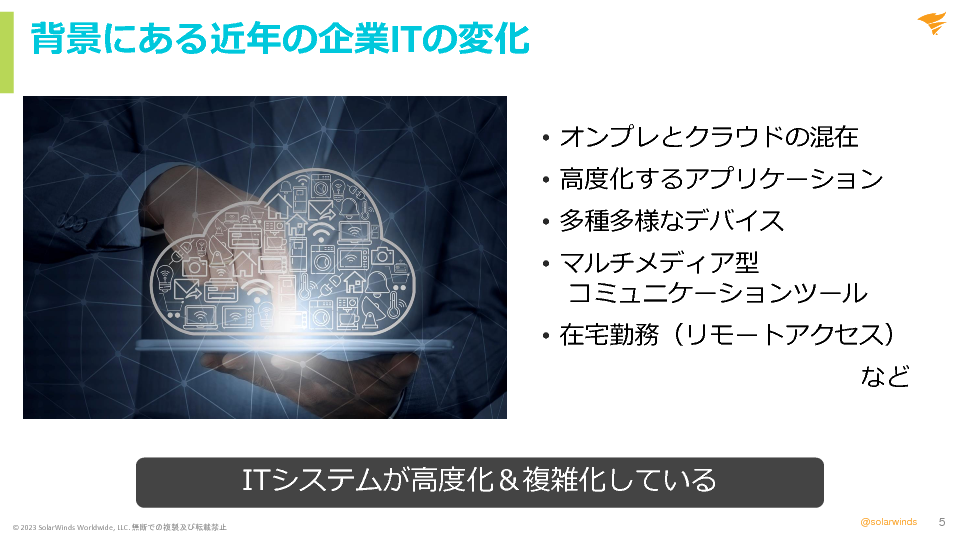 デジタル化が進む昨今、クラウドの普及やオンプレミスと併用したハイブリッドクラウド、アプリケーションやデバイスの多様化など、IT環境は複雑化の一途を辿っています。