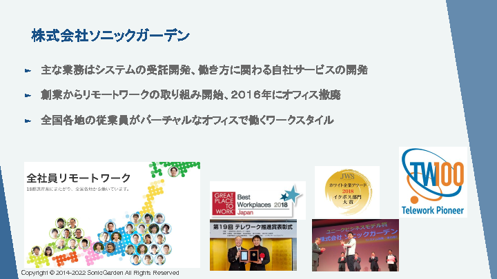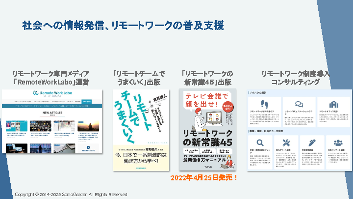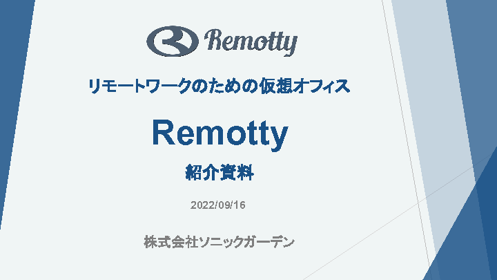 在宅勤務が普及するきっかけとなったコロナ禍よりも以前から全社員テレワークを実施しており、専門メディアや書籍出版による情報発信や、導入コンサルティングなども行っているソニックガーデン社が提供する、仮想オフィスで業界シェアNo.1を誇るサービス「Remotty」についても紹介します。