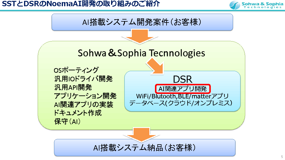 本セミナーでは、SST社のAI搭載組込み開発における開発サポート、DSR社の汎用AIであるNoemaAIの特長及び実績をご紹介予定です。AIを搭載したシステム開発を検討しているものの、どうやって進めればいいかわからない、どこに依頼してよいかわからないとお悩みの開発担当の方はぜひご参加ください。