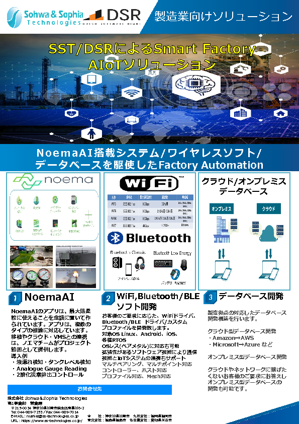 Sohwa & Sophia Technologies(以下SST)社は、AI技術パートナーのDSR社(ブランド名:Noema)と提携しました。SSTの組み込み技術とシステム統合の強み、そしてDSRのAIアプリ開発技術を融合することで、サーバーからエッジ、組み込みシステムまで対応可能な、パッケージソフトでは実現できない柔軟かつ伴走型のサポートを提供するAI導入ソリューションを実現します。