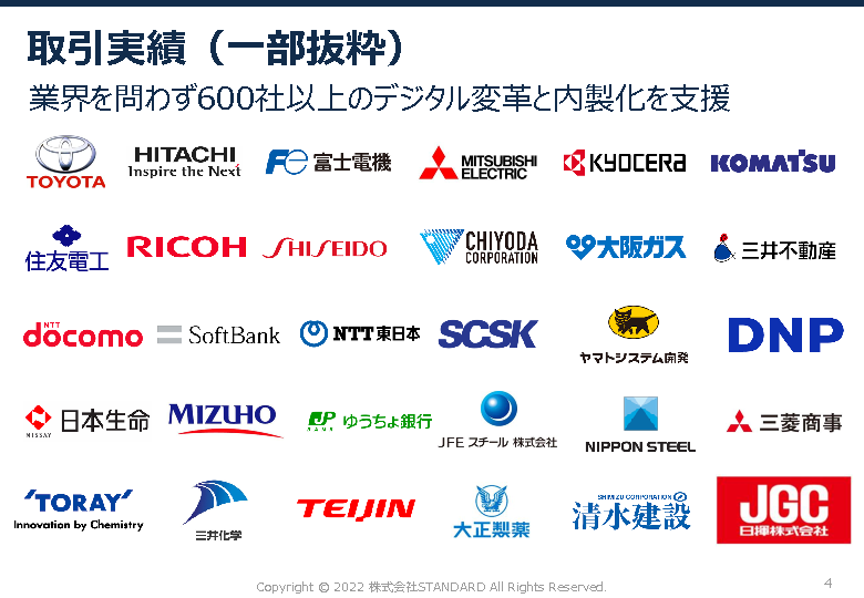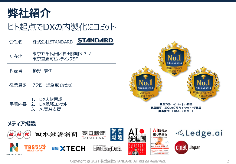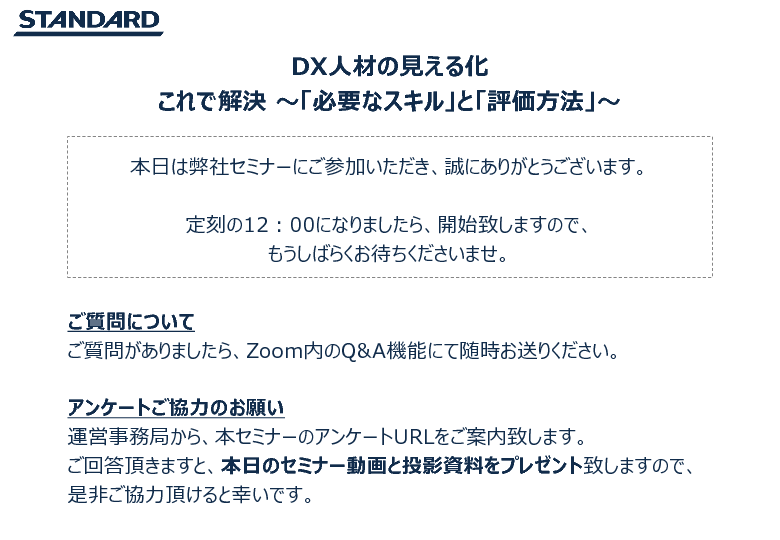 この「DX人材」育成の仕組みや必要なスキルを可視化する方法や、効果的な評価方法とその基準などを「DX人材の見える化」として明快に解説。これまで600社以上のDX人材育成の支援をしてまいりました株式会社STANDARDが実績と経験を基に見える化します。