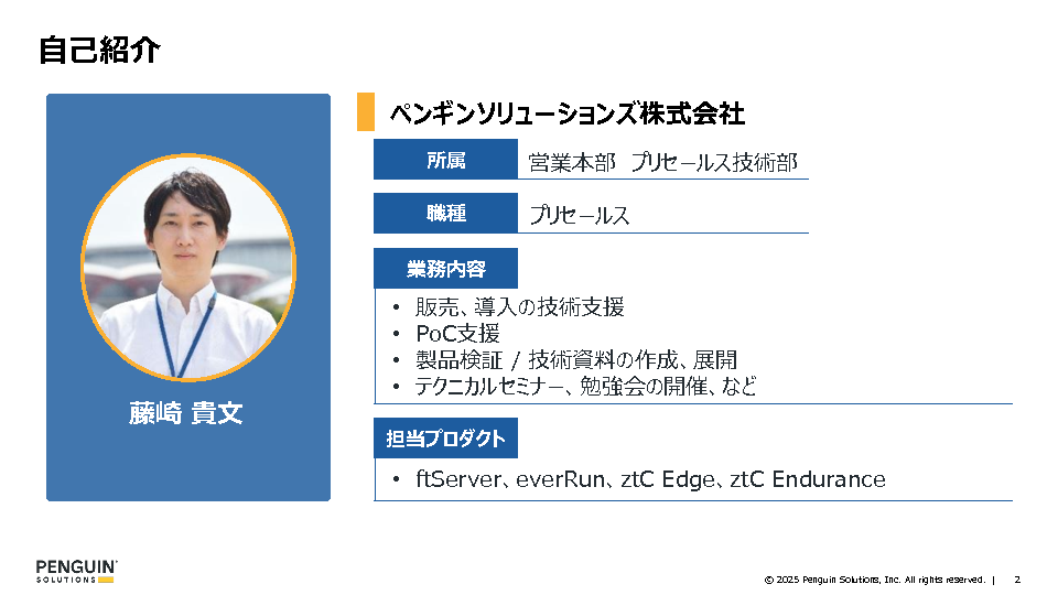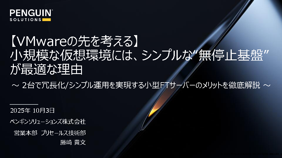 本セミナーでは、1〜5台規模の小規模仮想環境に最適な「たった2台で冗長化を実現」する、ペンギンソリューションズ株式会社(旧社名:日本ストラタステクノロジー株式会社)の無停止サーバー「Stratus ztC Edge」をご紹介します。