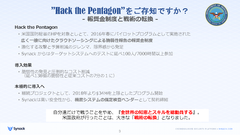 本セミナーでは、米国の政府機関や幅広い業種の民間企業が採用するクラウドソース・セキュリティ「Synack」の特徴やプラットフォームについて、事例を交えてご紹介します。