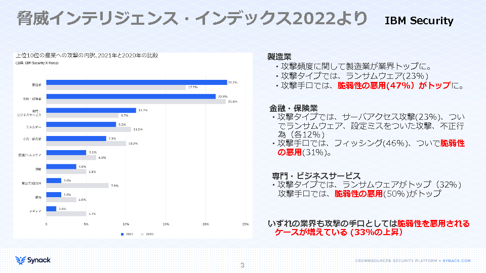 IPA(情報処理推進機構)が社会的に多大な影響を及ぼすセキュリティの脅威を順位付けする「情報セキュリティ10大脅威 2022(組織編)」では、7位に「修正プログラムの公開前を狙う攻撃(ゼロデイ攻撃)」が初めてランクインしました。また、「脆弱性対策情報の公開に伴う悪用増加」が前年度10位から6位に上昇しています。