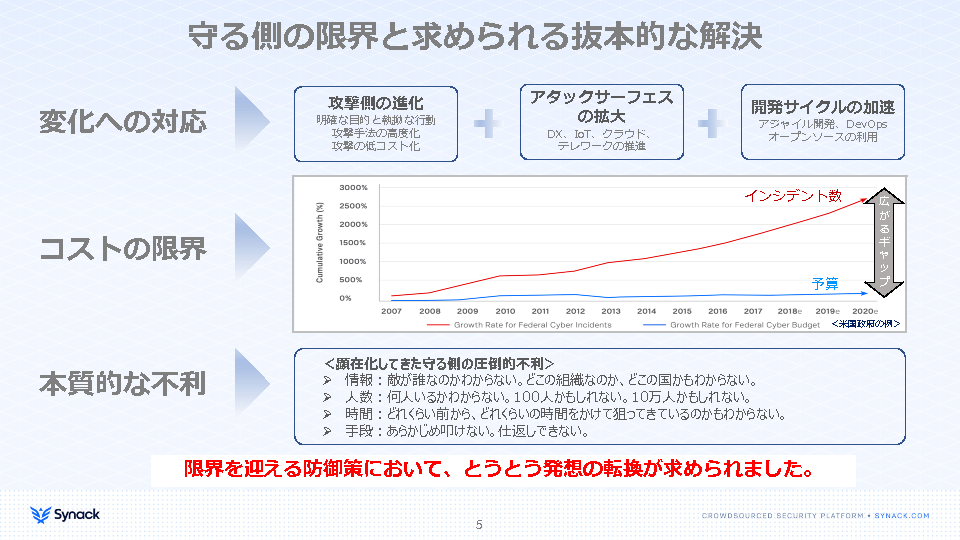 脆弱性への防御策として、多くの企業が「脆弱性診断」や「ペネトレーションテスト」を実施しています。ただ、少人数での画一的な調査が定期的に実施されることが多く、その手法や体制が長年変化しておりません。開発サイクルのスピードは上がり、デジタル化とともに広がり続けるアタックサーフェス、さらには攻撃者は常に進化し続ける状況で、あなたの組織の現状の対策は、十分でしょうか。